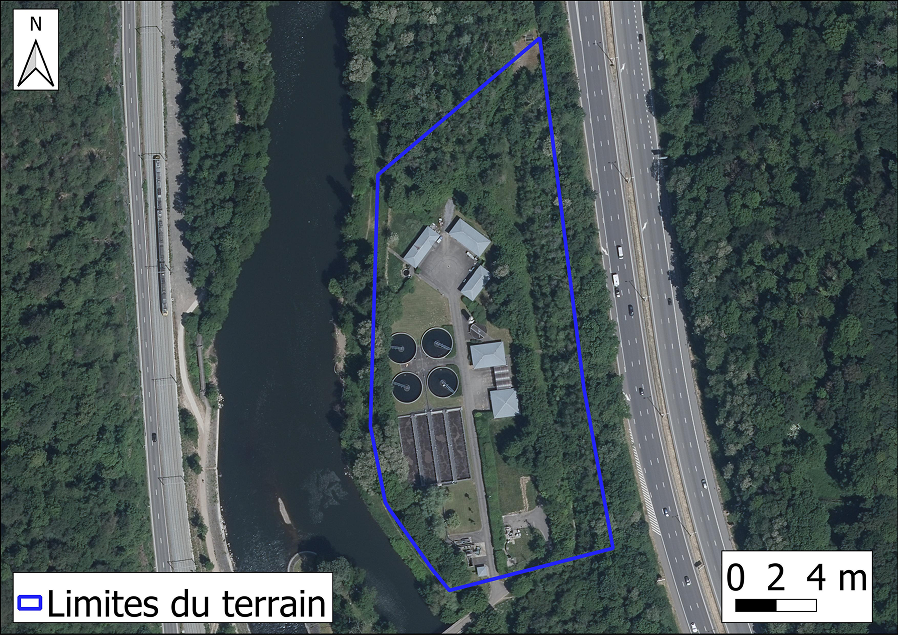 Les installations sont concentrées sur la partie ouest du terrain, tandis que les bordures nord et est sont constituées d’une zone boisée non considérée comme suspecte (plan 2023, illustrant la configuration des installations).